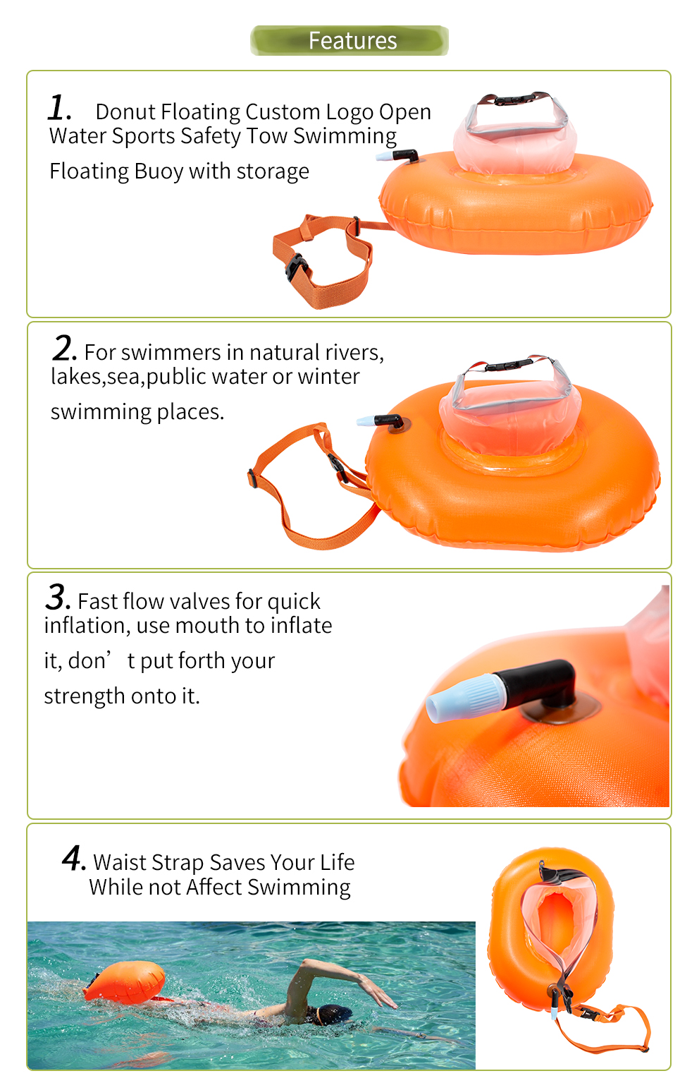- Your custom logo, text, and artwork can be printed on the swim buoys or their packages.